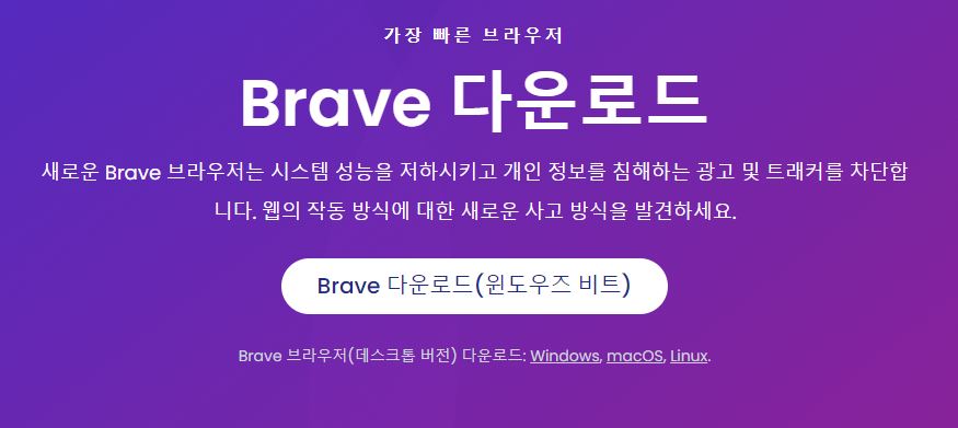 사이트 접속 후 첫 페이지에 [브레이브 다운로드 윈도우즈 비트] 라는 문구가 담긴 창이 뜰 것 입니다.