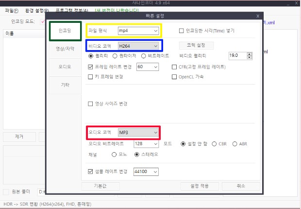 각각 색으로 테두리가 쳐져 있는 박스에 임의 설정을 통해서 인코딩을 할 때마다 지정한 설정으로만 되게 됩니다.
