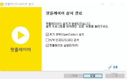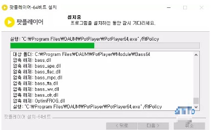프로그램이 설치가 되고 있으며, 초록색 게이지가 다 차면 팟플레이어 설치 완료창이 뜨며 끝나게 됩니다.