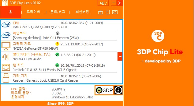 하지만 3DP CHIP 하나만 있으면 내 장치의 최신버전 파일들을 찾아 주는데요, 아주 편리하여 많은 사람들이 사용하고 있습니다.