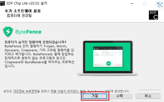 바이트 펜스도 거절을 눌러주고 진행 해주세요