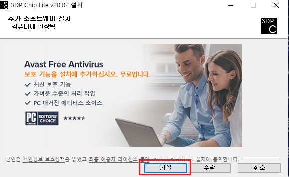 설치를 진행 하다가 avast free antivirus 창이 뜰 것인데 거절을 눌러주세요